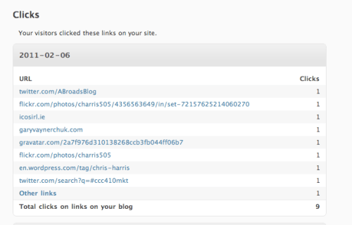 For the analytics on my blog, I had to use just the basic WordPress analytics; each time I tried to install Google Analytics plugin- my blog just wouldn’t have it. Throughout my about 13 weeks managing this blog, I’ve had 915 views, averaging 10 per day. There was one day in February that made my blog seem much more popular that it actually is, because I purchased my domain name. Since I’ve purchased http://www.triciacawley.com , my views have increased. On the day I purchased my domain name, I set it as my Facebook status and the amount of views compared to the average day was ridiculous. That day I had 106 views with people copy and pasting my url into the address bar. A flaw, I realized a few hours after my status was set, was that I should have listed it as a URL so people could just click on it, drawing more traffic from Facebook. Also on that day, there were 9 links clicked on that brought traffic to other websites, including my friend’s Flickr.